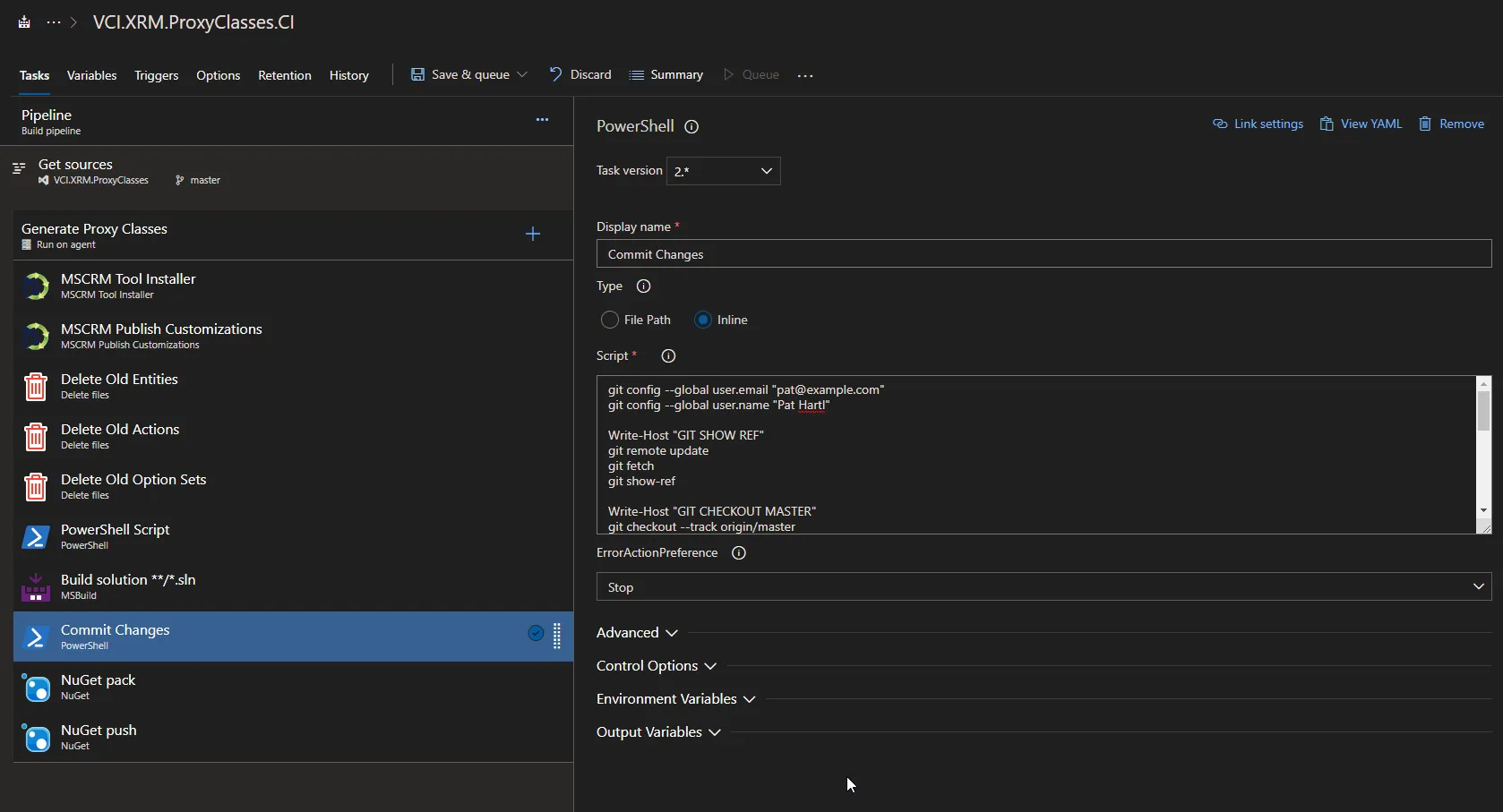 Now add another PowerShell task, and we’re going to be using another inline script. Modify the user.email and user.name as you see fit: