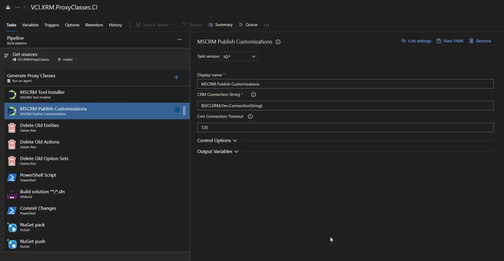 Now add the “MSCRM Tool Installer” task. There is nothing to configure on this one. Next, add the “MSCRM Publish Customizations” task. This isn’t required, but it’s generally a good idea. Under your “CRM Connection String” parameter, we’re going to want to reference an environment variable. Mine is named VCI.XRM.Dev.ConnectionString, but you can really call it whatever you want.