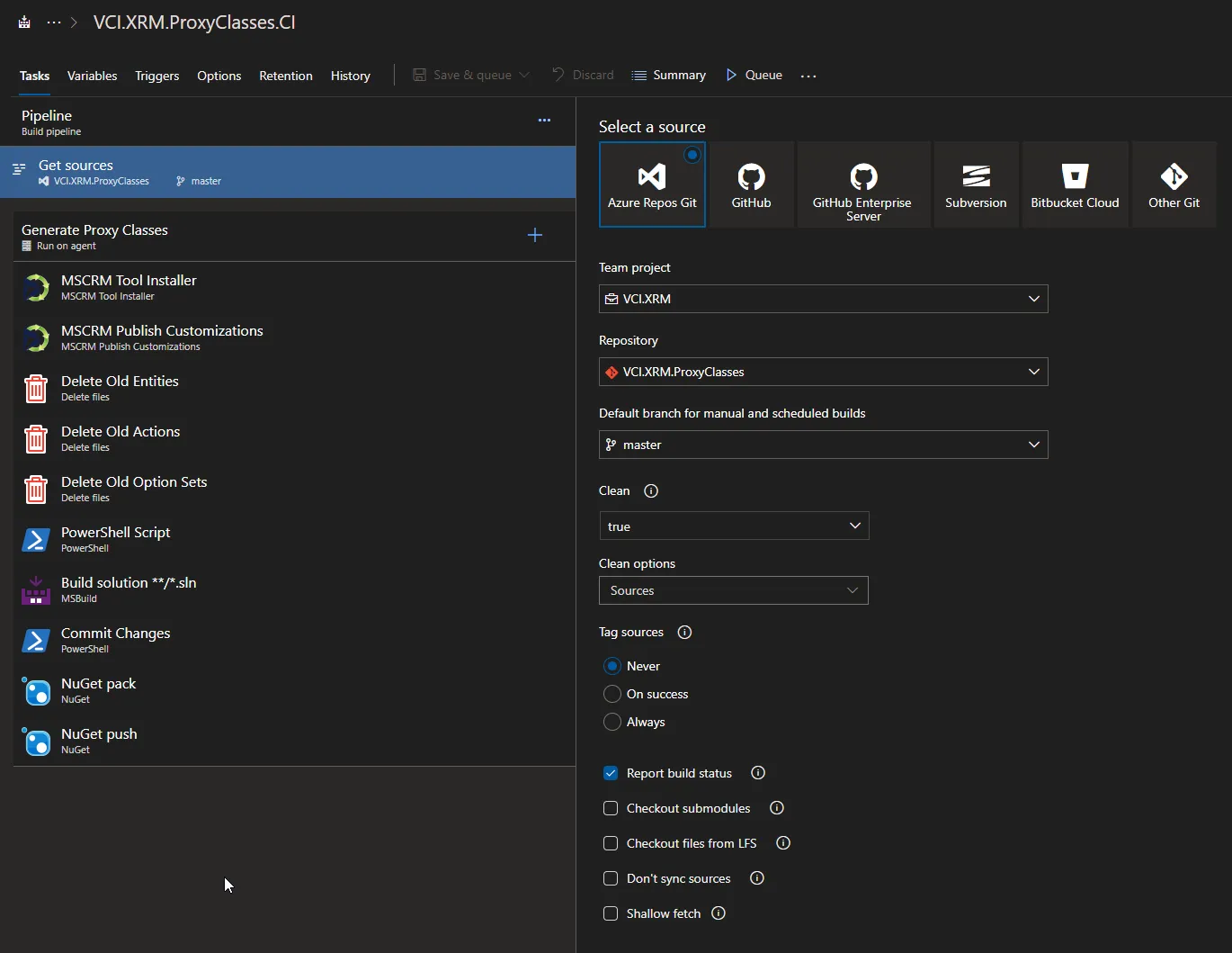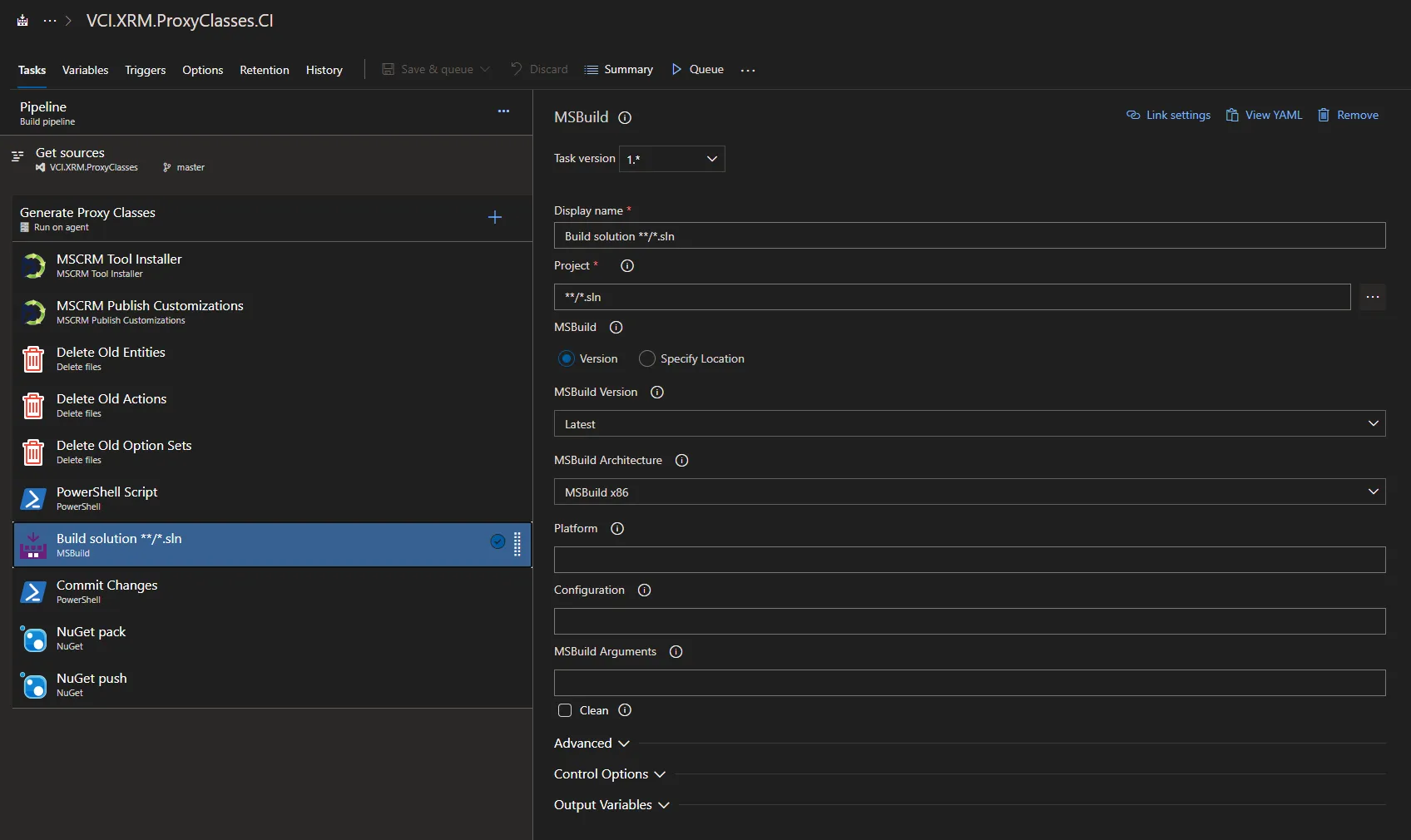Now we’re going to move over to DevOps. Go over and install the Dynamics 365 Build Tools from the Azure Pipelines marketplace. Next, make a new pipeline in DevOps. I’ve done mine in the classic interface as I have a general hatred for YAML, but I’m positive you could do it all in that as well. We’ll do a dive into all of the options, but here’s what mine looks like: