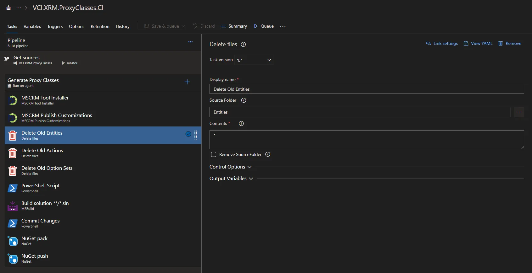 I added three tasks for deleting out the old classes that were generated. The class generator can be set to do this, so you probably don’t need to do it. They’re all the same, I just delete the contents of Entities, Actions, and Option Sets folders:
